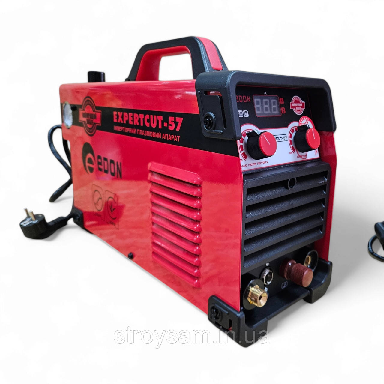 Плазморез Edon CUT-57 — професійний апарат для різання металів, що працює від мережі 220 В. Максимальна товщина чистого різання досягає 15 мм, роздільного до 18 мм. У конструкції плазморіза є високочастотний осцилятор, який відповідає за безконтактне підпалювання дуги плазмозагляду. Завдяки невеликій споживаній потужності (до 7,5 кВт) апарат плазмового різання Edon CUT-57 можна під'єднувати практично до будь-якої домашньої або гаражної електромережі. Повітря, яке подається від компресора, за допомогою плазмоутворювача іонізується і стає струмопровідним. На виході плазва оглядану утворюється плазмова дуга завдовжки 3-6 сантиметрів, температура якої досягає 30000 градусів. Для коректної роботи плазморіза об'єм ресивера компресора має бути не менш ніж 50 літрів і продуктивність приблизно 400 літрів на хвилину. Апарат плазмового різання комплектується: плазмованому марки P-80, вбудованим редуктором із відділювачем вологи, додатковими соплами та електродами, напрямним роликом, інструкцією й гарантійним талоном.